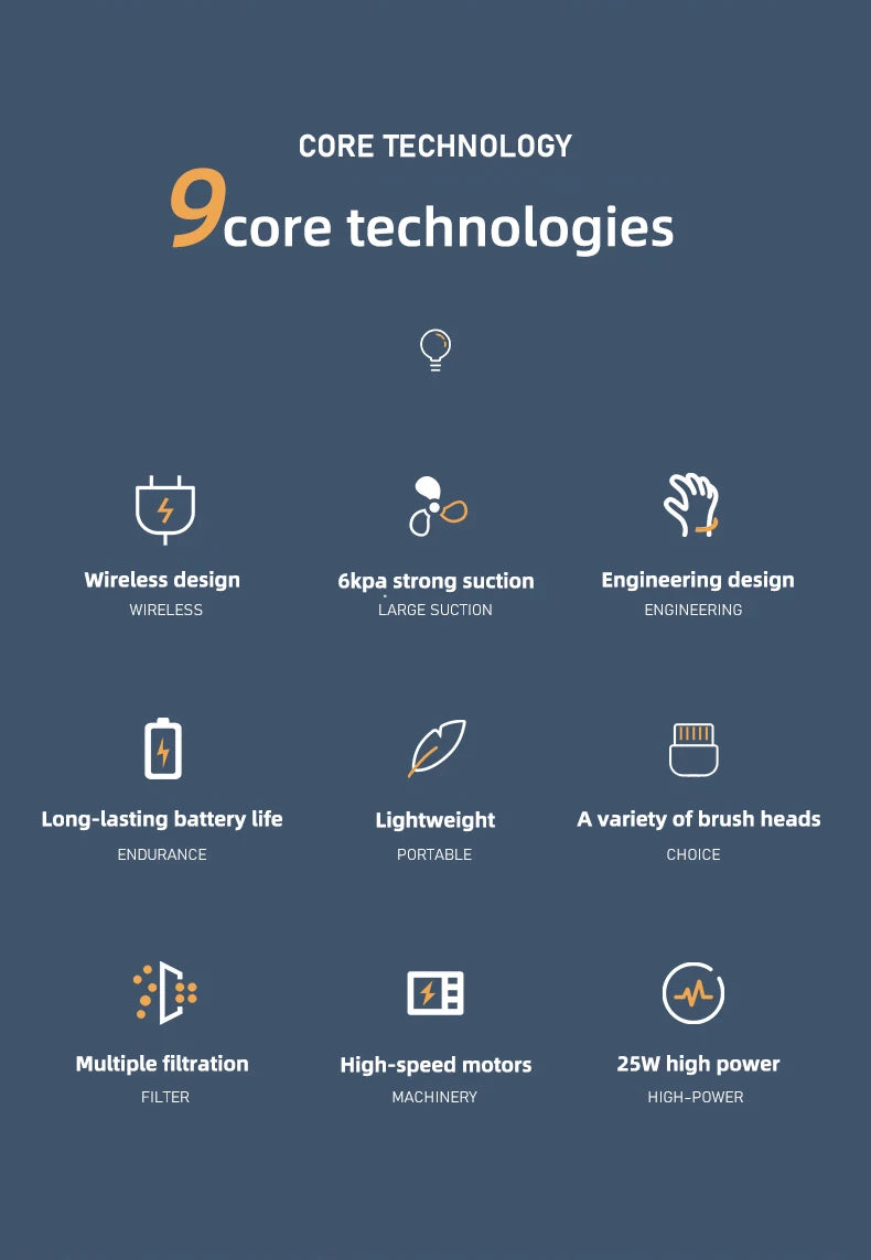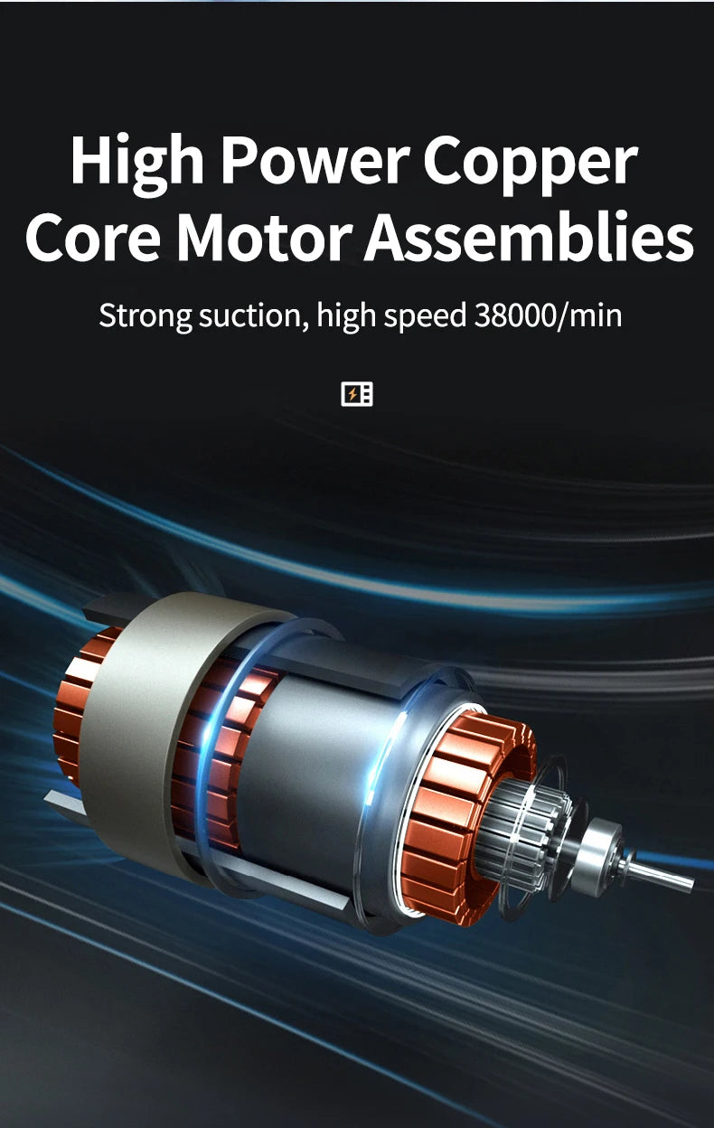 Ta mini brezžični sesalnik združuje izjemno sesalno moč 50000Pa, kompaktno zasnovo in vzdržljivo 2000mAh baterijo, kar omogoča popolno svobodo gibanja in temeljito čiščenje kjerkoli.