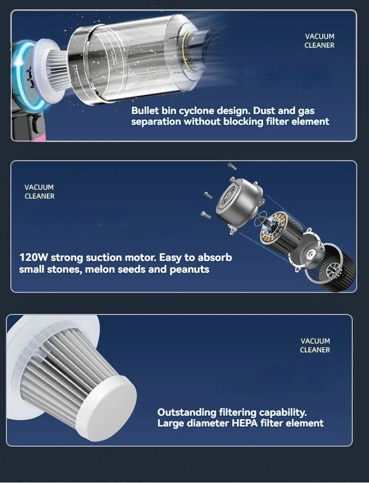 Zahvaljujoč zmogljivosti, lahkosti in priročni obliki je ta mini sesalnik obvezen del vsakega doma ali avtomobila.