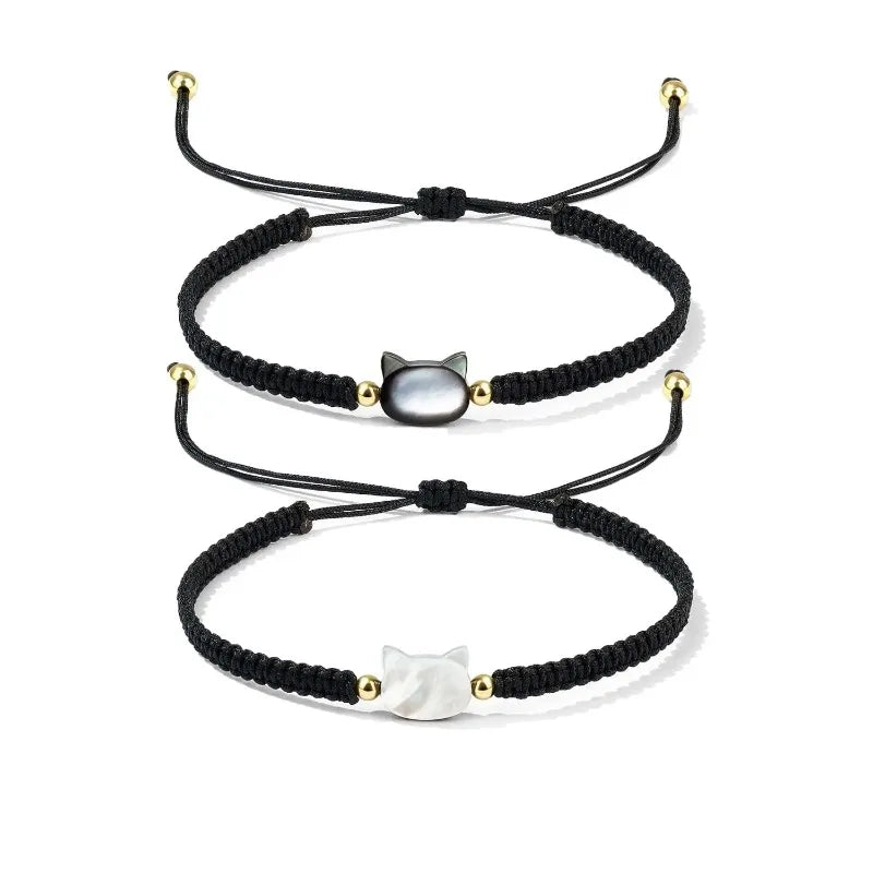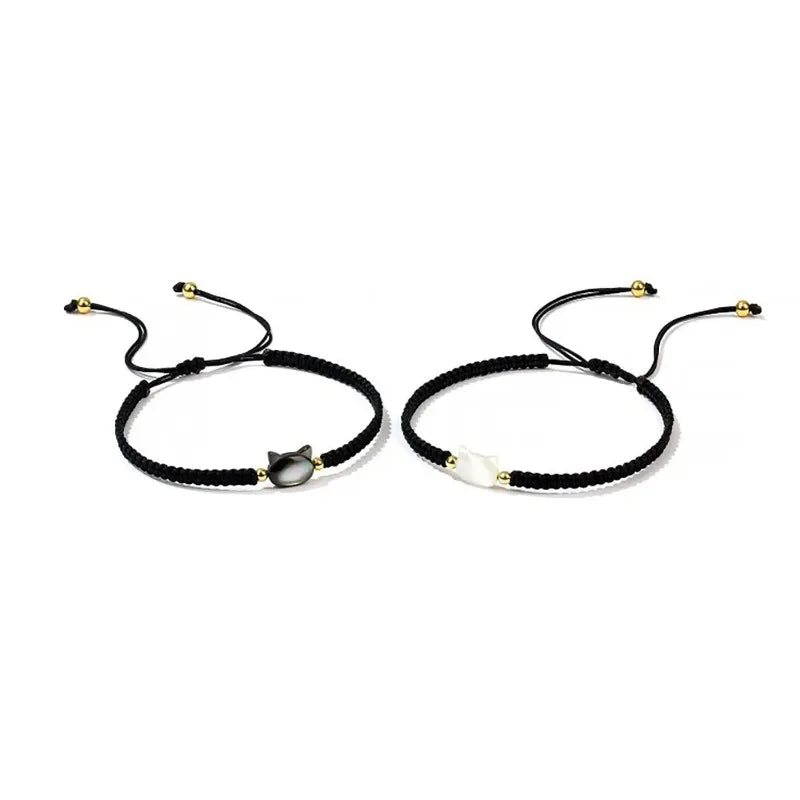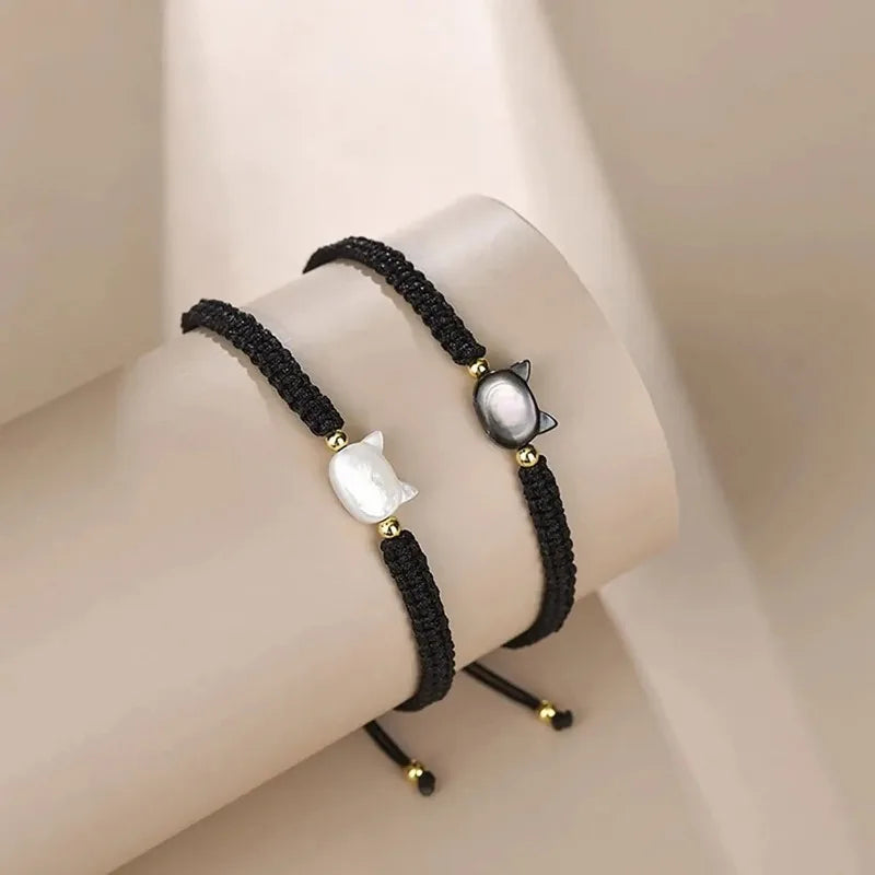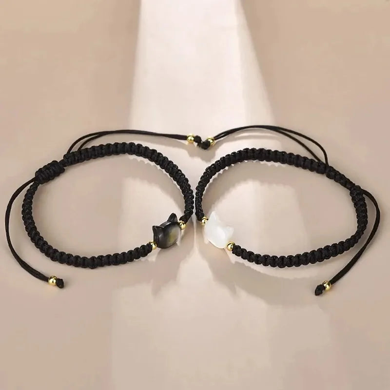 Ročno izdelana zapestnica za pare združuje lepoto naravnega mesečevega kamna in obsidijana z igrivo mačjo tematiko. Črno-bela kombinacija ter nežni detajli ustvarjajo ljubek in romantičen izgled, ki je primeren za vsakodnevno nošenje ali posebne priložnosti.